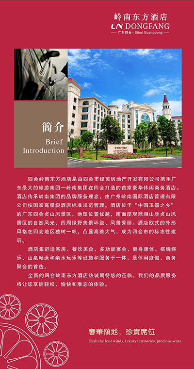 四会岭南东方酒店是由四会市绿茵房地产开发有限公司携手广东岭南集团在四会打造的豪华休闲商务酒店,外观集欧式古堡和现代风格为一体,凸显高雅大气,成为四会市的标志性建筑。客房别致精美,设施完善,服务体贴。