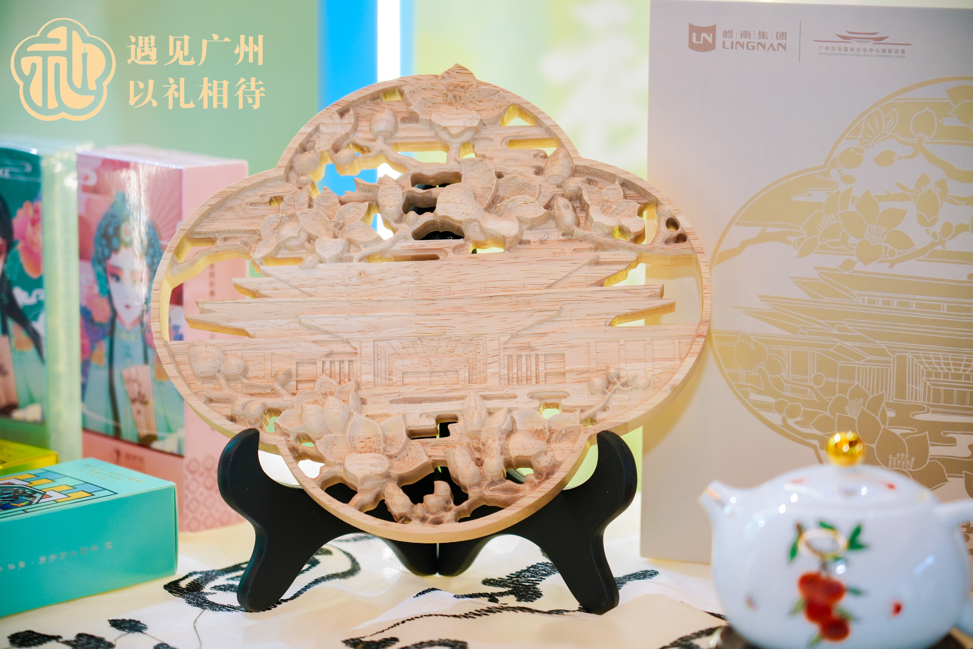 潮州木雕,又称“金漆木雕”,包含雕刻、贴金、金漆画等多种技法,是我国非物质文化遗产之一,散发出独树一帜的艺术魅力。贴金手工木雕礼盒套装以国际会堂建筑为设计灵感,搭配广州市市花木棉花,展现岭南文化的丰富内涵。